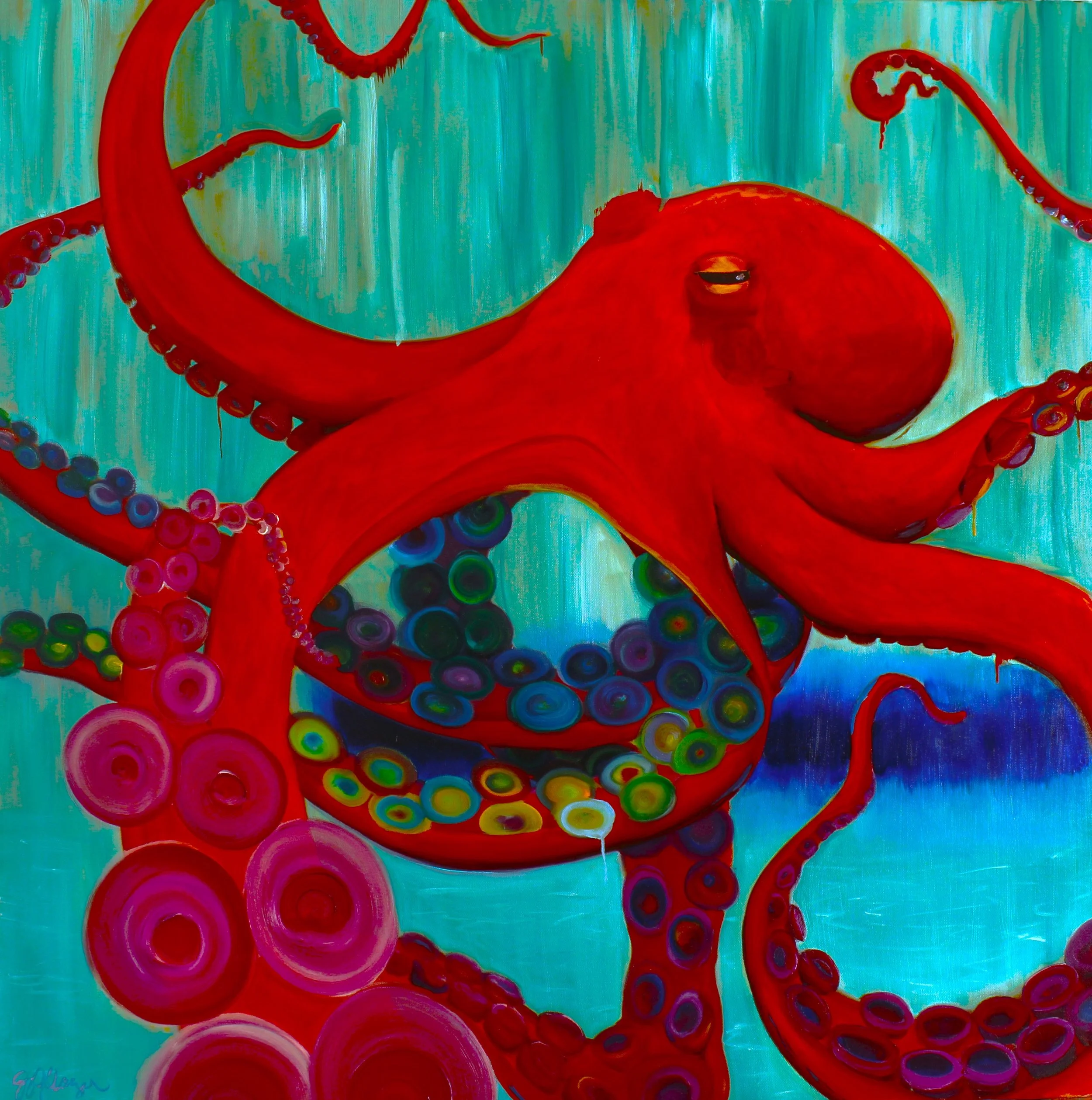 In this lively and whimsical painting by Art by Julie P, a bright orange octopus takes center stage against a dazzling teal background. The octopus's tentacles are adorned with multicolored suckers, creating a mesmerizing visual contrast that captivates the viewer's gaze.
